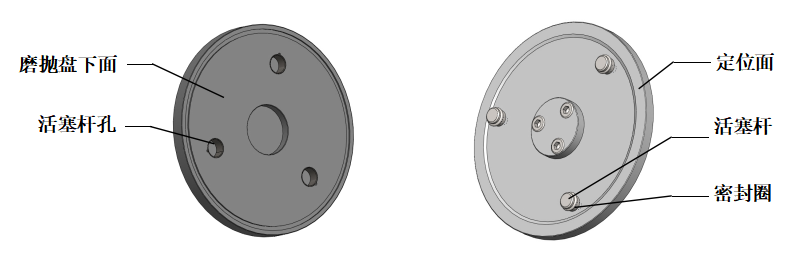01 磨拋盤可快速更換,兩手拿住磨拋盤輕輕上提即可取下來;將另一個(gè)磨拋盤兩手拿平,目測(cè)磨拋盤的三個(gè)活塞桿孔與三個(gè)活塞桿基本對(duì)應(yīng)時(shí)落下,感覺其中一個(gè)孔對(duì)應(yīng)時(shí),輕微擺動(dòng)磨拋盤使另兩個(gè)也對(duì)應(yīng)后將盤持平插入,再用手控壓一下,使磨拋盤下面與磨拋?zhàn)亩ㄎ幻嫱耆佑|。