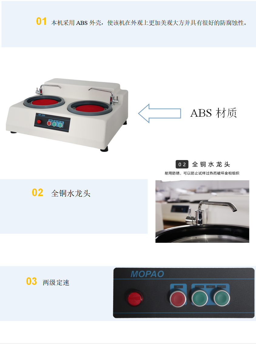 本機帶有冷卻裝置,可以在研磨拋光時對試樣進行冷卻,以防止因試樣過熱而破壞金相組織。該機使用方便、安全可靠,是工廠、科研單位以及大專院校實驗室的理想制樣設備。
